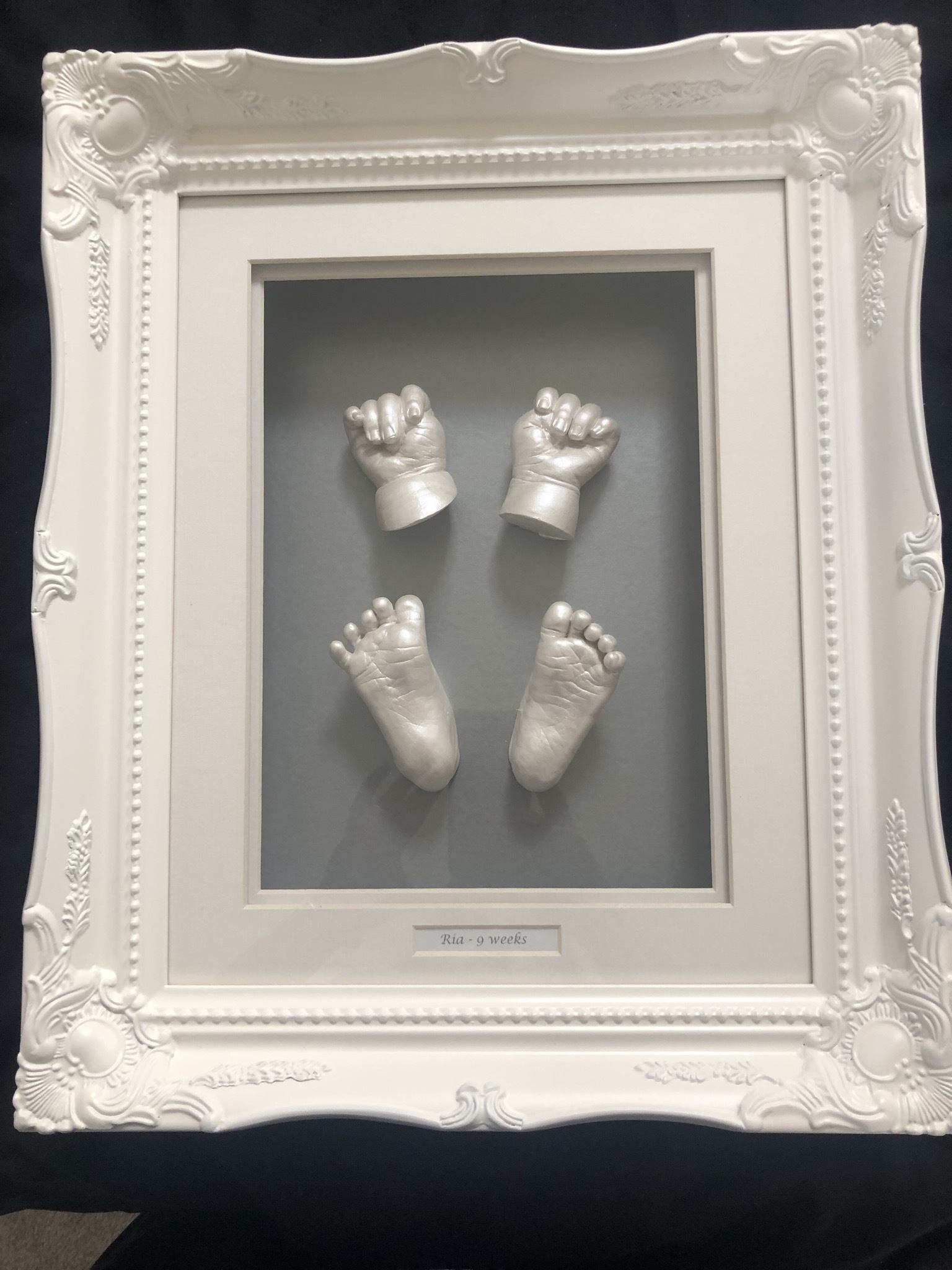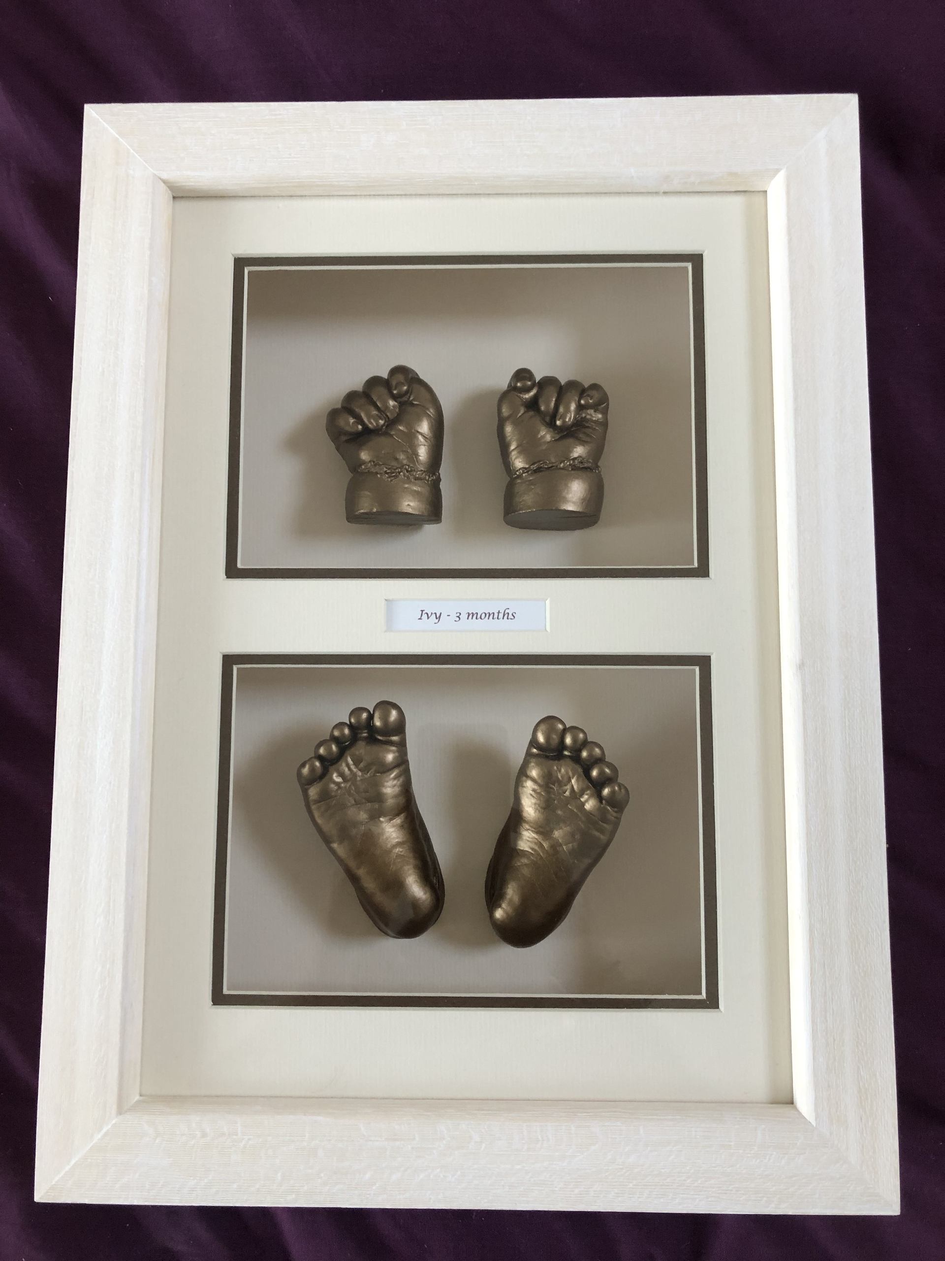 The casting appointment will take 20 – 30 minutes; this includes time to take the casts and to choose your frame and finish. The frames are handmade to order for each child; the finished framed piece is ready to collect in 4-6 weeks.